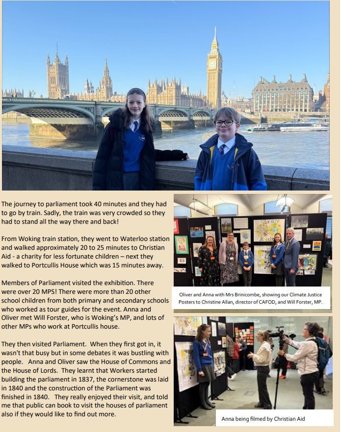 Below is a piece from our Spring newsletter published after two of our pupils won places to be tour guides for a climate justice exhibition at parliament. The children helped show round many MPs and experienced what democracy looks like in both the House of Commons and the House of Lords.